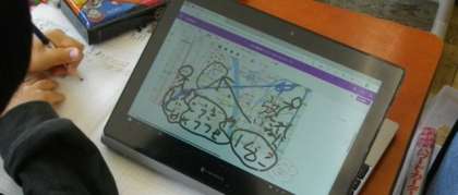タブレットを取り外して,見やすいようにキーボードに取付け直しているお友達もいます