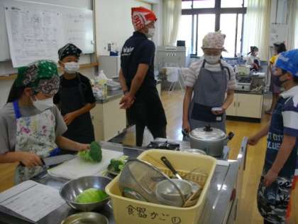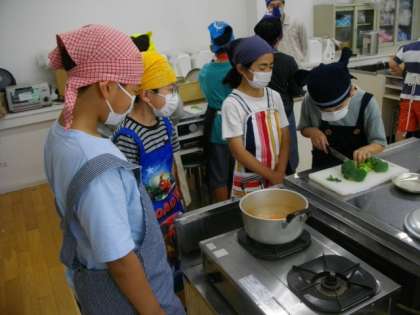 5年生は家庭科の学習で,調理実習をしています。安全に気を付けて,調理をすすめています。