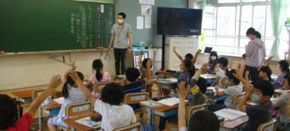「ももたろうのお話を説明するときに,どんな言葉を使いますか」たくさん手が挙がっています。