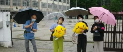 校門前には,本部役員の皆さんが,「いちたくん」を抱っこして,子どもたちに声をかけて頂きました。令和4年度に登場したのは双子のもふもふ「いちたくん」です。