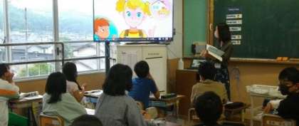 3組では,タブレットで写真を提示しながら,自分のすきなものや物事について発表しています。