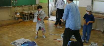 2年生は新聞紙を使って”へんしーん”しています。タブレットのカメラ機能を使ってかっこいいポーズをパチリ。