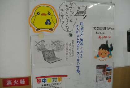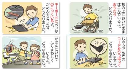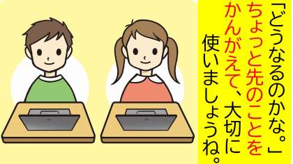職員室前に、「いちたくん」がタブレットを大切につかうためにどうすればいいか、問題を出しています。ここでは、よくない使い方の例をイラストで示して「どうなると思いますか」と問いかけています。よくない使い方に「ダメ」「よくない」と教えることも大切ですが、ちょっと先のことを自分で考えて(判断して)行動できる力をさらに身につけてくれることを願っています。