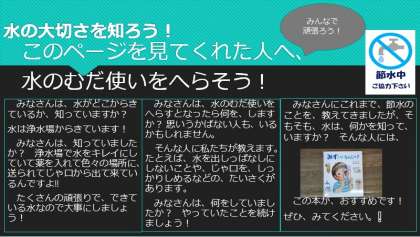 4年生は社会科の学習で、水道水が、どこから、どのようにわたしたちの元にとどいているかを調べました。すると、大量の水が琵琶湖から来て、浄水場を通って、水道水として家庭に送りとどけられていることがわかりました。
