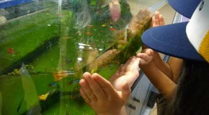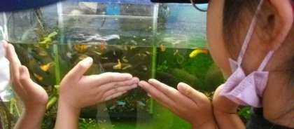 水槽の前に手を近づけるだけで、グッピーやネオンテトラが集まってきます。