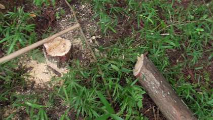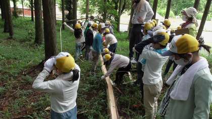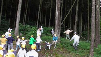 皆でロープを引っ張って、木を倒します。