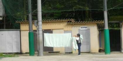 教室のカーテンを順次、洗濯しています。ようやく晴れたので、運動場横で干すことができました。