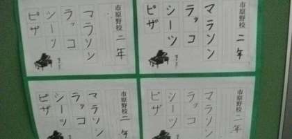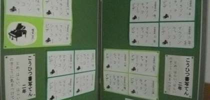 2年生の書写の作品を掲示しています。一文字ずつ、ていねいに書けましたね。