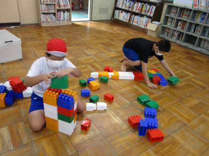 3組では、自立活動の学習で、大きなブロックを使い、お互いに協力して1つのものを作る学習をしました。