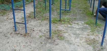 総合遊具の下に、雑草が増えてきましたので、取りのぞいています。