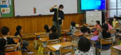 1年生は、長さ比べをしています。長い紙テープが登場しました。