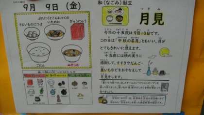 十五夜(じゅうごや)として親しまれ、ススキや団子をお供えして月を観る習慣があります。また、収穫祭と相まって、このころに収穫される里いもをお供えする習慣もあることから【芋名月(いもめいげつ)】とも呼ばれています。給食では、「里いもの煮つけ」「里いも土佐煮」「いものこ汁」など様々な献立に里いもを使っています。