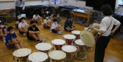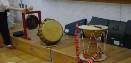 ゲストティーチャーをお招きし、コリアの楽器としてチャンゴ・チン・ケンガリ等を紹介していただきました。