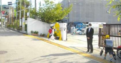今日から、将来、教職に就くことを目指している学生2名が市原野小学校で教育実習を受けます。さっそく校門前で子どもたちに「おはようございます」と元気よく声をかけています。
