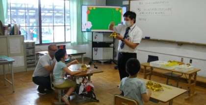 3組は、敬老の日にプレゼントするお祝いの飾り作りにとりくみました。ひねったりねじったりしながら丁寧に差し込んでいきます。色をぬったり切ったりしているお友達もいます。お友達のいいところを真似て、さらに工夫しています。メッセージカードもできました。