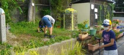 園芸委員会のお友達が、水やりをしたり草抜きをしたりしています。