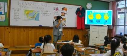 今日は、オンラインで先生から「おとなりのくにについてしろう」というテーマでお話があり、遊びや食べ物の紹介がありました。その後、各クラスでは遊びを体験したり、ハングルを使って自分の名前を書いたり、絵本の読み聞かせを聞いたりしました。