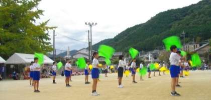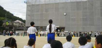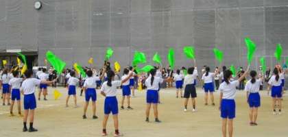 6年生の集団行動とフラッグを使った演技が始まりました。