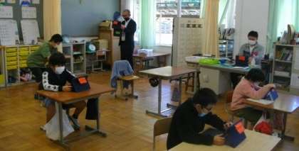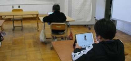 3組は、iPadを使って、「AR動物となかよし」の作品を作っています。自分の姿を写真で撮り、犬やカンガルー、恐竜などの生き物とのコラボ作品です。どんなストーリーがでいるか楽しみですね。