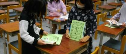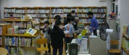 3年生と5年生が、静市学習情報センターで本を借りています。
