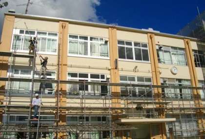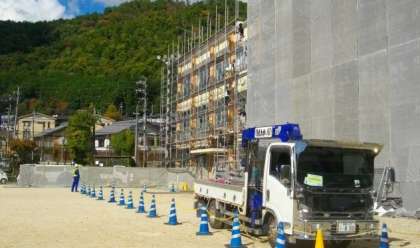 鉄骨の足場を、見事な連係プレーで取り外していきます。