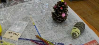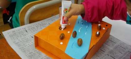 アイデア満載のかわいい飾りができました。ドングリをつかって、「ころころ迷路」を作っているお友達もいますね。