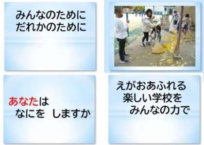 国語や道徳の時間に話し合いをしているお友達のいましたね。これは3年生のお友達の活動の様子です。総合的な学習の時間に、もっともっとすてきな地域や学校にするためにアイデアを出し合っています。すばらしいと思うのは、考えるだけでなく、行動をしていることです。今年は、たくさんイチョウの葉や実がなりましたが、管理用務員さんといっしょに掃除をしようということで行動してくれました。いつもきれいな学校になりましたね。ありがとう。委員会活動でお花を植えたりうさぎの世話をしたり、みんなが楽しめることを考えたりしてくれていますね。ありがとう。