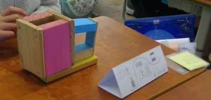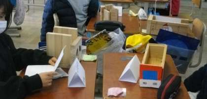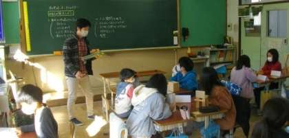 4年生は、図画工作科で作った作品の紹介を、友達同士で行っています。