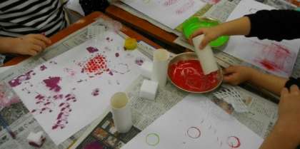 1年生は、いろいろな形のものに絵の具をつけて、スタンプしています。