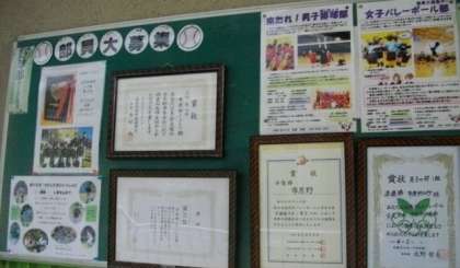 体育館横(南側)に掲示板を2枚設置しています。1枚はスポーツ少年団の活動を紹介しています。盾の写真や賞状が飾られているので、ぜひご覧ください。