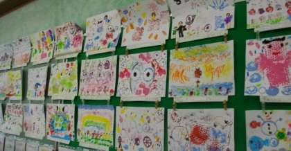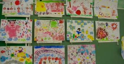 1年生が、いろいろな材料を使ってスタンプをした作品です。