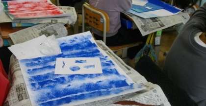 2年生は、図画工作科でステンシルを使った作品づくりに取り組んでいます。