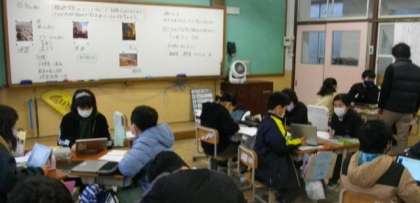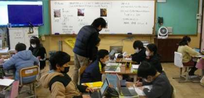 5年生は、社会科で自然災害について調べています。タブレットを使って調べている子もいれば、文書作成ソフトに考えをまとめたり、プレゼンソフトにまとめたりしています。めあてに沿って、自分なりの方法を選んで活用しています。