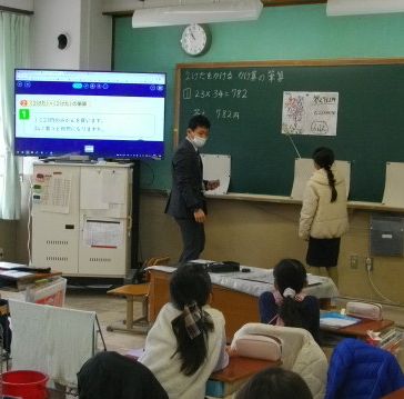 今日は、家で学習した内容(予習した内容)をもとに、意見交流からはじめる学習活動からスタートしました。そのあと、どうしてそのような計算をするのか、筆算の意味を改めて考えながら振返りをしています。授業の最後にはデジタルドリルの問題を3問取り上げて、まとめに臨みました。