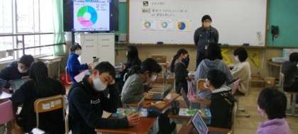 5年生は、タブレットを使って、安全に関する学習をしています。予想される危険なことと、それを防ぐために、予めどんなことに気をつけたらよいのかを話し合っています。