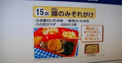 今日の献立は、とりめし、カレイのみぞれがけ、大根葉のいため物、春物のいため物、うの花サラダ、なめたけ煮です。カレイは骨ごと食べられます。