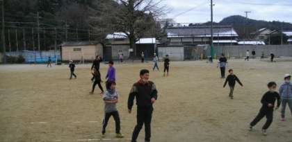 今年は、運動場全面を使って、サッカーを楽しんでいます。(今日は3人の先生もいっしょに活動をしています。)