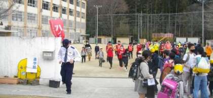 子どもたちの下校時間に合わせて「パトラン」見守り活動がスタートしました。地元の静市交番からは、制服姿で見守りランニングをしていただきました。(一番上の写真の左端の方です。毎朝、パトカーで子どもたちの登校を見守っていただいています。)