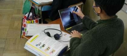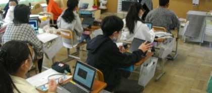 6年生は、外国語科で、スピーチ内容をタブレットを使って録画しています。