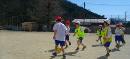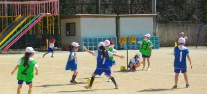 青空のもと、1年生がいっしょうけんめいにボールを追いかけています。