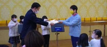 市原野橋付近で毎週見守りをしていただいている皆様に感謝状が届きましたので、来校していただきました皆様にお渡しをしました。ありがとうございました。