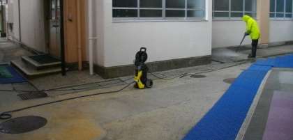 高圧洗浄機で、校舎周りをきれいにしています。教室もワックスがけをしてきれいになりました。