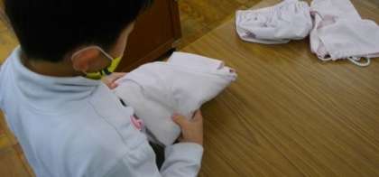 1年生が給食の準備をしています。エプロンも上手に片づけられましたね。
