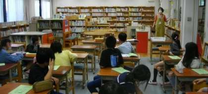 4年生が、学校図書館利用のオリエンテーションを受けています。