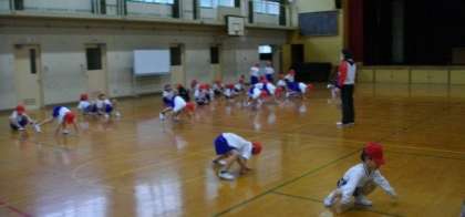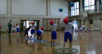 1年生は、体ほぐしの運動に取り組んでいます。両手両足を使って移動したり、スキップをしたり、ボールを投げてキャッチしたりと、いろいろな動きに挑戦しています。
