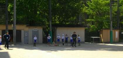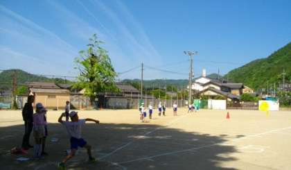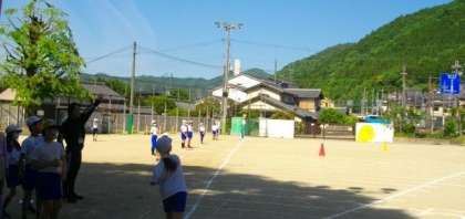 5年生が、ソフトボール投げに取り組んでいます。