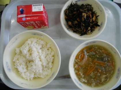 麦ごはん、牛乳、夏野菜のあんかけごはん、ひじきの煮つけ