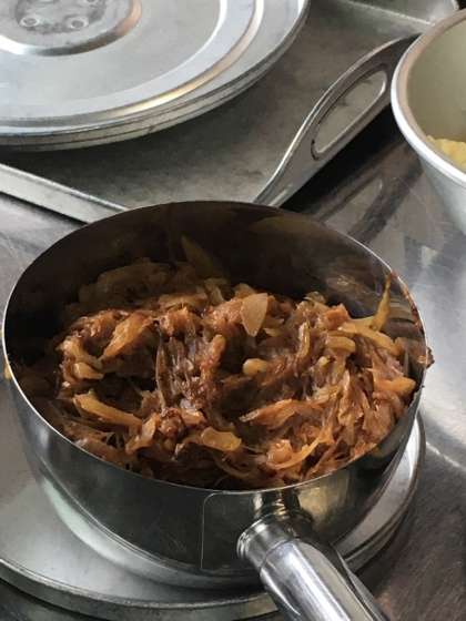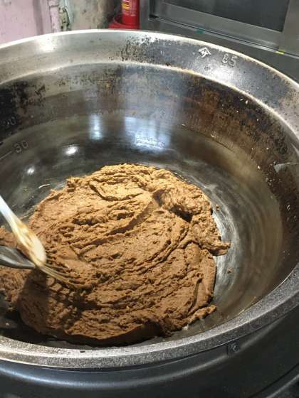 給食室で手作りのルウが完成しました。カレールウよりも少し長い時間練り上げることで、濃い色をつけています。現在、あめ色玉ねぎとともに他の具材と煮込み中です。