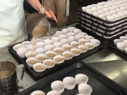 江戸時代から伝わる和菓子【ういろう】を給食室で作っています。米粉・さとう・黒ざとう・水を混ぜ合わせて生地を作り、紙カップに流し込みます。現在、スチコンで蒸し上げ中です。