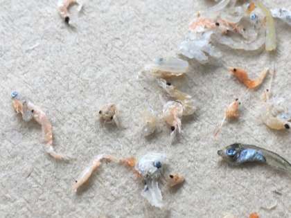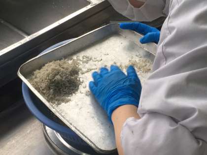 ごま酢煮に使用する「しらすぼし」の移し替え作業をしています。作業の中で、様々な魚の稚魚やえび、かにの赤ちゃんなどが見つかります。給食室では、「ちりめんモンスター(略してちりモン)」と呼んでいます。